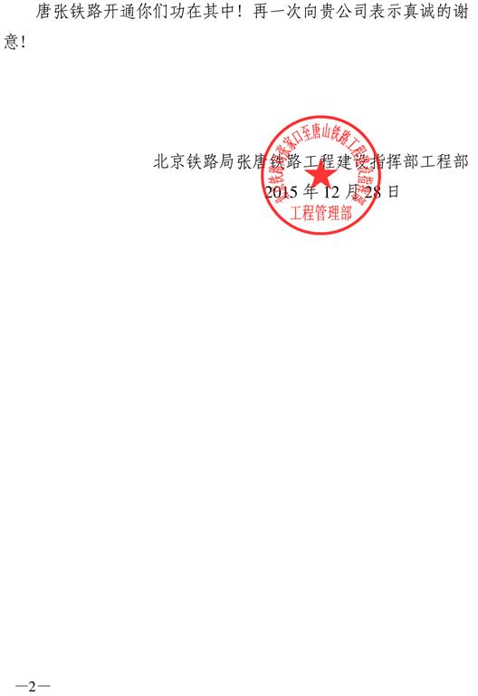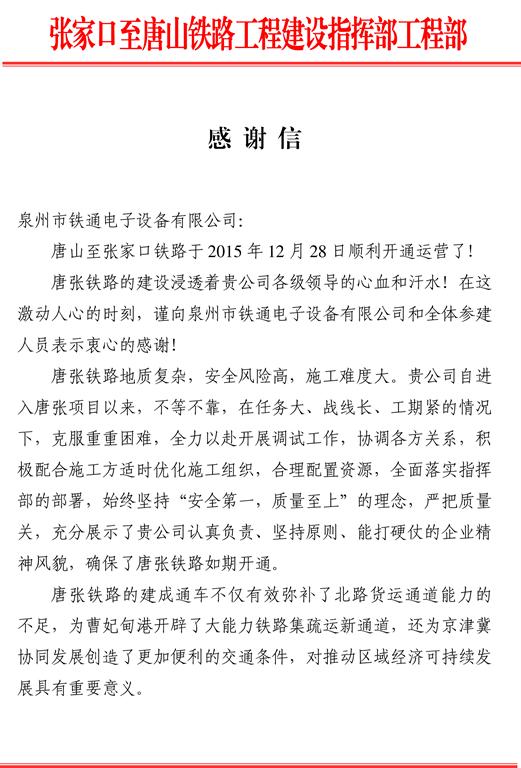 北京铁路局张唐铁路工程建设指挥部工程部向我司发来感谢信