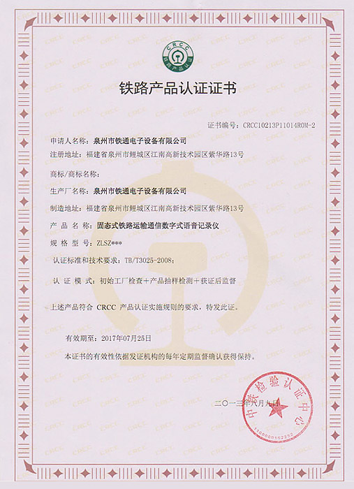 ZLSZ型数字语音记录仪(以下简称“记录仪”)是我公司近年来开发的新型固态式数字语音记录仪,于2013年获得中铁检验认证中心铁路产品认证证书,证书编号:CRCC10213P11014ROM-2。
